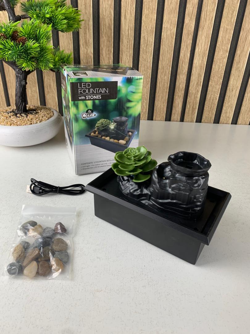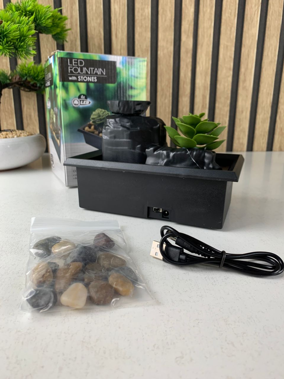 تأتي النافورة مع كيس من الحصى غير المنتظم، مما يعطي مظهرًا طبيعيًا أكثر ويضيف لمسة جمال لأي زاوية في المنزل أو المكتب.
